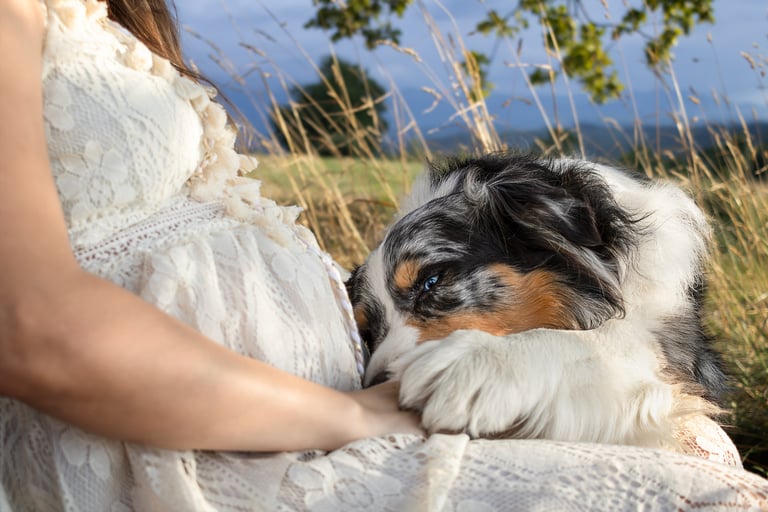 Le pack Intimité vous permet de suivre votre histoire en deux temps : l’attente, puis les premiers jours avec bébé. C’est la formule idéale si vous souhaitez garder une trace simple, douce et cohérente de cette période. Votre animal peut bien sûr être présent sur les photos, pour que votre meute soit complète.